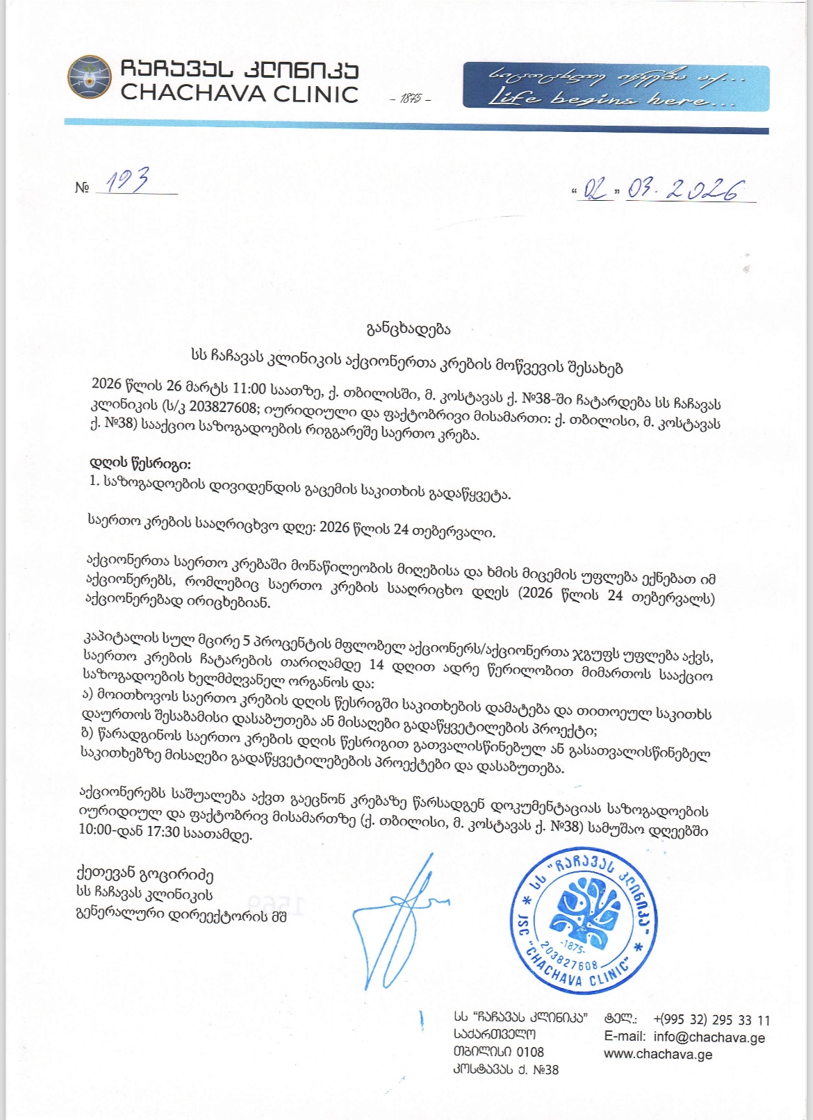 სს "ჩაჩავას კლინიკის" აქციონერთა კრების მოწვევის შესახებ